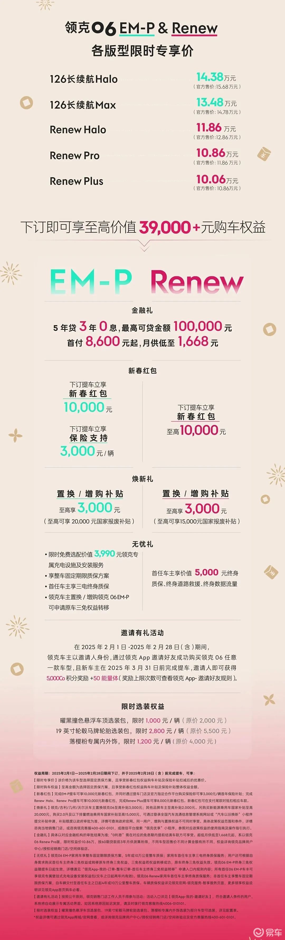 2月28日(含)前购买2025款领克08 EM-P车型,可享全系限时优惠价17.58万元起,相比指导价优惠了2万元。值得注意的是,该2万元包含了5千元的保险补贴,需在官方指定渠道购买保险方可生效。