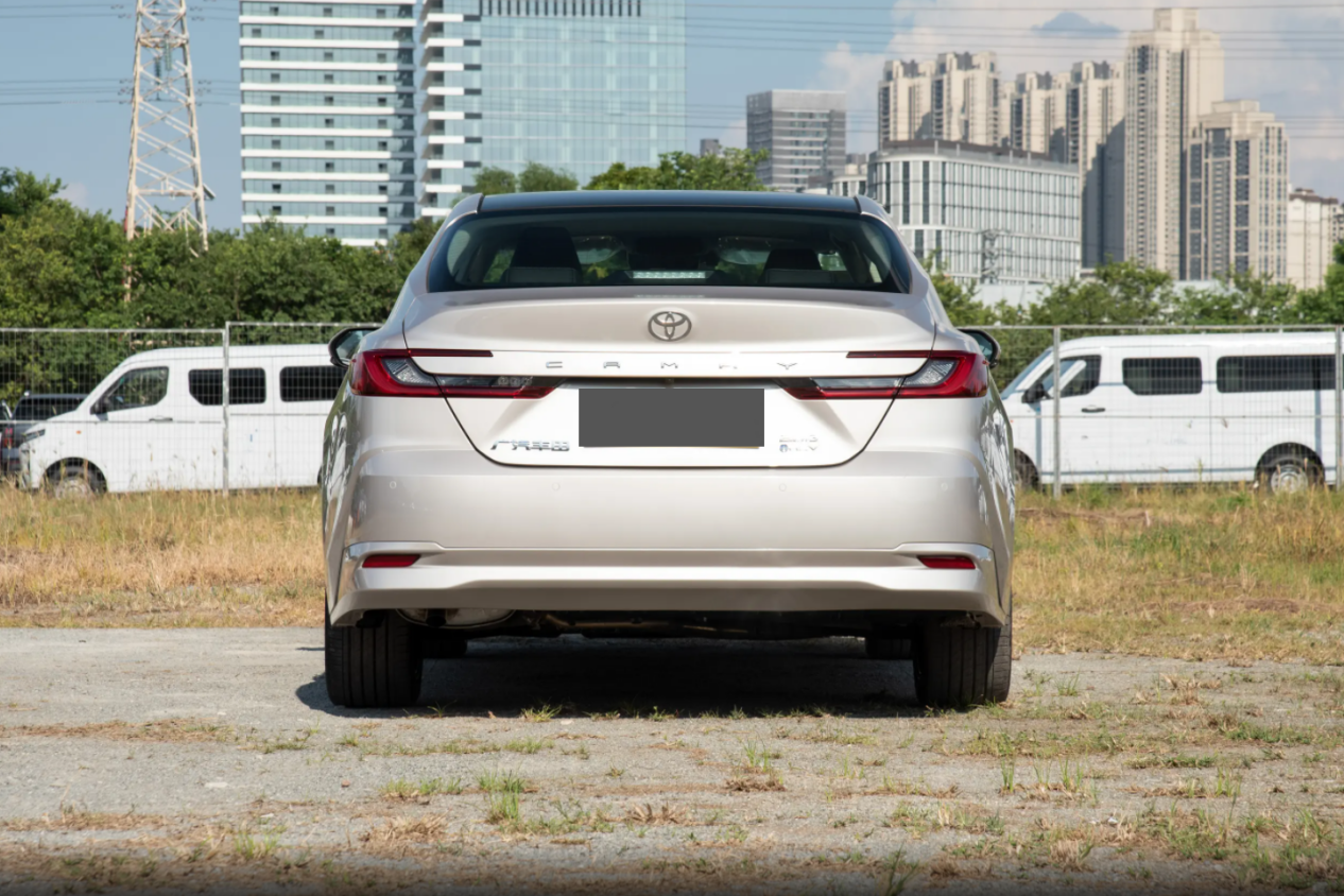 凯美瑞双擎尊贵版的车身线条流畅利落,车身侧面没有多余的修饰,也没有夸张的设计,整体造型修长舒展,搭配17英寸铝合金多辐轮毂,营造出一种沉稳内敛,低调绅士的氛围。车尾设计简洁耐看,窄长的C字形尾灯与车头相呼应,搭配红色装饰条和上方的英文标识,增强了整车的辨识度。