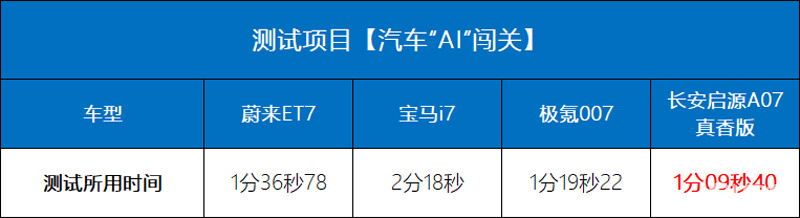 语音控制系统的识别指令越精准、完成指令时间越短,成绩就越好,如果有车外音控功能,则是一个加分项。在这项测试中,长安启源A07真香版再次以超群的实力赢得了第一。