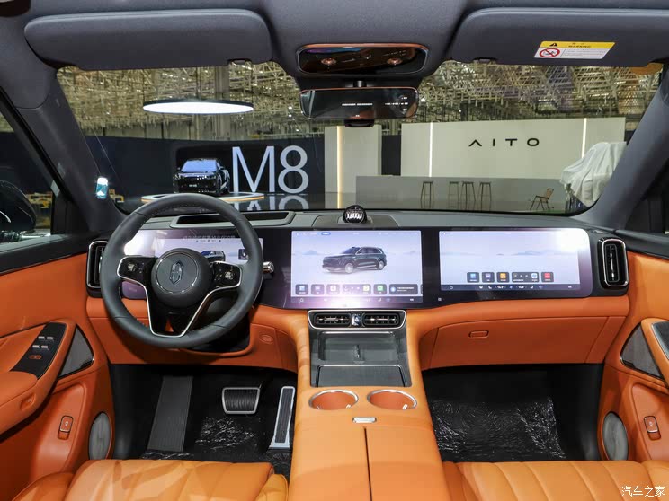 内饰方面,问界M8提供提供三排六座、双排五座两种布局,内饰采用双环抱式座舱设计。问界M8内饰提供了4种配色,标配“白沙杏”和“赤茶橘”,可选装“琥珀棕”和“星云红”配色。六座版右后标配零重力座椅,五座版右后搭载准零重力座椅。新车还将搭载HUAWEI SOUND配备19单元音响系统,主驾头枕上标配2个喇叭,为主驾提供更好的环绕感、沉浸感。