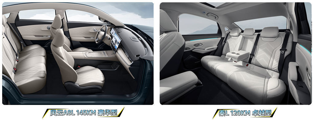 风云A8L和秦L 在车型尺寸上相近,同为2790mm轴距,腿部空间都能让乘客坐得舒服。不过风云A8L的空间利用更灵活,像日系空间魔术师一样:后排座椅整排放倒后,直接变出2000L大空间,装多人行李箱、婴儿车、露营装备毫无压力,比只能4/6比例放倒的秦L灵活。