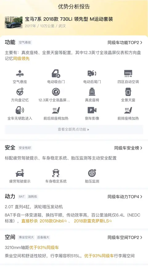 在优势分析部分,该车型在动力性能、配置丰富程度以及舒适性方面表现出色。车辆搭载的2.0T发动机提供了强劲的动力输出,加速迅猛且平顺,为驾驶者带来了卓越的驾驶体验。同时,车辆还配备了多种智能驾驶辅助系统,如前后驻车雷达、倒车影像等,进一步提升了驾驶的安全性和便捷性。在配置方面,该车型配备了多项豪华配置,如真皮座椅、全景天窗等,其中12.3英寸全液晶屏仪表和方向盘记忆等配置更是同级领先,展现了宝马品牌的豪华形象。在空间方面,车辆拥有宽敞的内部空间和舒适的乘坐环境,无论是商务出行还是家庭出游都能轻松应对。行李厢容积达到了515L,优于93%同级车行李厢空间,满足了消费者对于储物空间的需求。