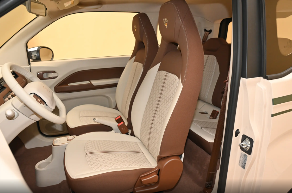 来到车内,惊喜依旧,很难想象到这是一款售价不到五万的代步小车,大面积软包材质和缝线的加入进一步提升内饰质感,咖色内饰营造了一个温馨的乘车空间。中控台层次分明,正中间集成了一个9英寸触控屏,甚至还设计了一个带有模拟收音机天线的外壳,看起来确实很可爱。UI界面设计简单,内置车联网、地图导航、手机交互等基础科技功能,实用性确实挺强,甚至还支持手机APP远程控制,像倒车影像、泊车雷达这样的实用性配置也没有缺席。驾驶位正前方依旧保留了一块显示屏,用于展示常用行车信息,大部分常用功能都可以通过物理按键和旋钮调节。