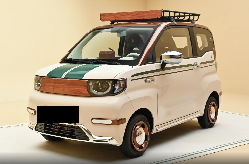 即便是小轮毂也加入了双拼配色,看起来确实很精致,2026款QQ冰淇淋车身长度3030mm,轴距1960mm,因为前后包围的装饰件不同,所以不同版本的车身尺寸也会略微有所区别。视线移动至车尾,独特的设计手法忍不住让人多看几眼,多种元素混合在一起同样给人一种美式复古的感觉,U字形尾灯由木纹饰板连接,车牌上方位置还加入了一块绿色涂装,下包围处集成长条状镀铬金属条,元素看似繁多实则很和谐,除此之外还有一个小尺寸金属架,可以挂一斤左右的物品,看起来确实很个性。