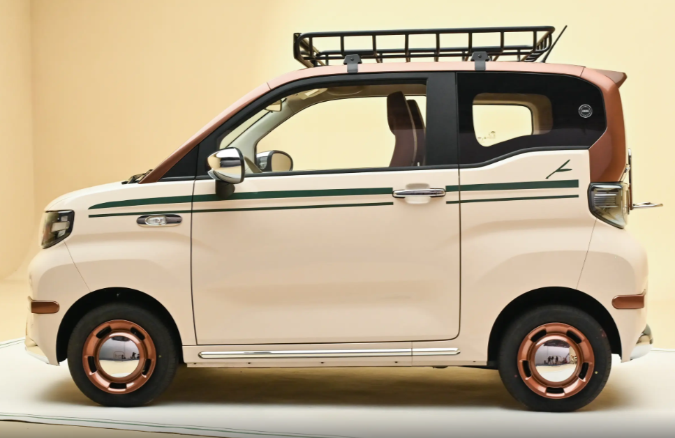 除了有着高颜值,该有的便捷性配置和设计也不少,毕竟顶配车型的身份摆在那里,圆润复古大灯由木纹装饰板连接,中间位置集成快慢充接口,官方表示该车在一小时以内就能充满电,即便慢充也仅需五个小时左右。车顶部分加装带有木纹装饰板的金属行李架,它并不仅仅是一个单纯的装饰,而且具有30kg的承载质量,收纳一到两个行李箱没有问题。